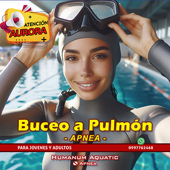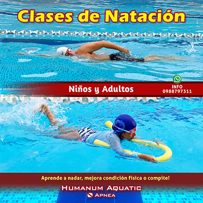 Clases y entrenamientos de APNEA (Buceo a Pulmón) Dirigido a todas las personas que quieren iniciar en este deporte o para aquellos apneistas que desean mejorar su técnica y marca bajo el agua. Nuestro programa incluye acondicionamiento físico, mejora de técnica en piscina y claves en entrenamiento para ganar resistencia, fuerza y control mental; esto te permite mejorar tu rendimiento en cualquier otro deporte, más información. Facilitamos los implementos de apnea (aletas, máscara y snorkel), si no tienes. Llama o escríbe a nuestro whatsapp para más información 0988797311 o al correo info@humanumaquatic.com